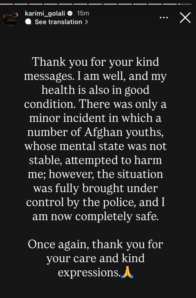 “Thank you for your kind messages. I am fine and my health condition is reassuring. It was only a minor incident in which a number of Afghan youths, whose mental condition was not stable, attempted to harm me. However, the police fully brought the situation under control, and I am now completely safe.”