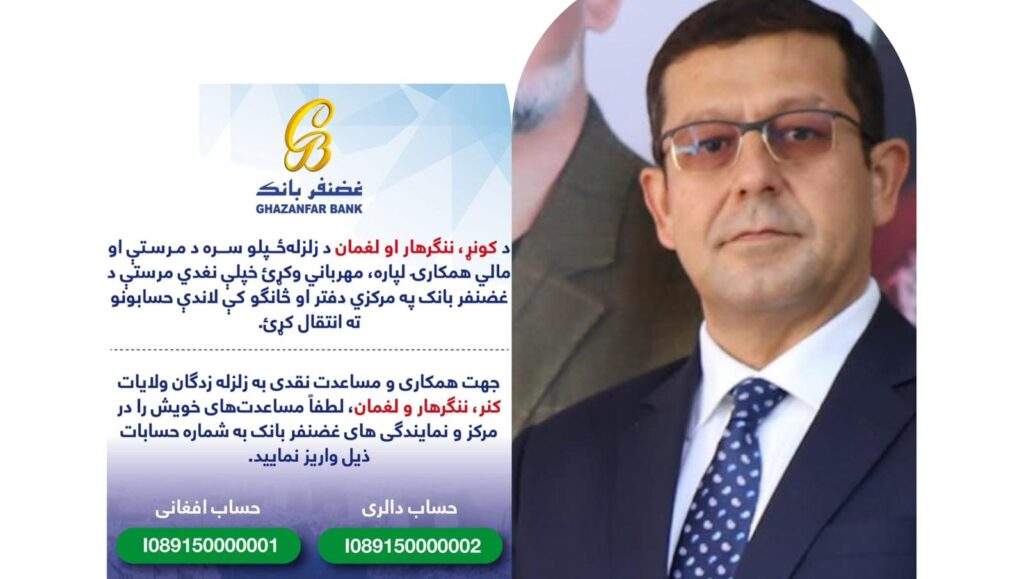 پس از زلزله اخیر در ولایات کنر، ننگرهار و لغمان، غضنفر بانک در صفحه رسمی فیسبوک خود اعلام کرد که مردم میتوانند مساعدتهای نقدی خویش را از طریق حسابهای افغانی و دالری این بانک به زلزلهزدگان انتقال دهند.