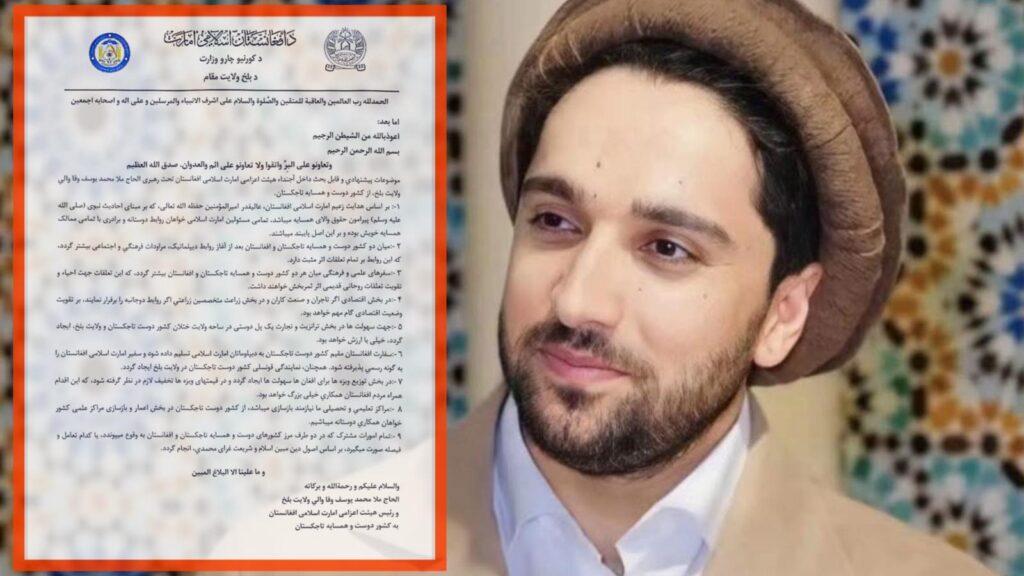 این نامه، که با سربرگ رسمی «امارت اسلامی افغانستان» منتشر شده، حاوی دستوراتی صریح برای ایجاد روابط دیپلماتیک، اقتصادی و فرهنگی با تاجیکستان است. در متن آن آمده است که والی بلخ باید برای «برادری اسلامی و همکاریهای مشترک» با مقامهای تاجیک تماس برقرار کند و زمینه گشایش کنسولگری و مبادلات تجاری را فراهم سازد.