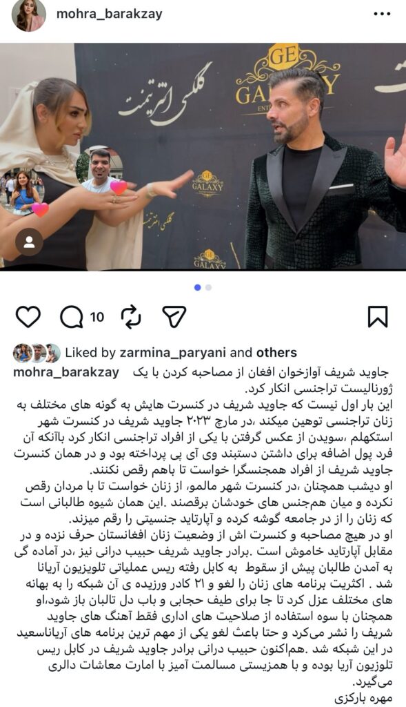 مهره بارکزی، خبرنگار تراجنسی، با انتشار یادداشتی تند در صفحهاش مدعی شد که جاوید شریف، آوازخوان مشهور افغان، از انجام مصاحبه با او در یک رویداد هنری سر باز زده است. به گفته بارکزی، این «نخستین رفتار تبعیضآمیز» از سوی شریف نیست و او پیشتر نیز در برنامههایش با افراد تراجنسی و همجنسگرا برخوردهای غیرحرفهای داشته است.