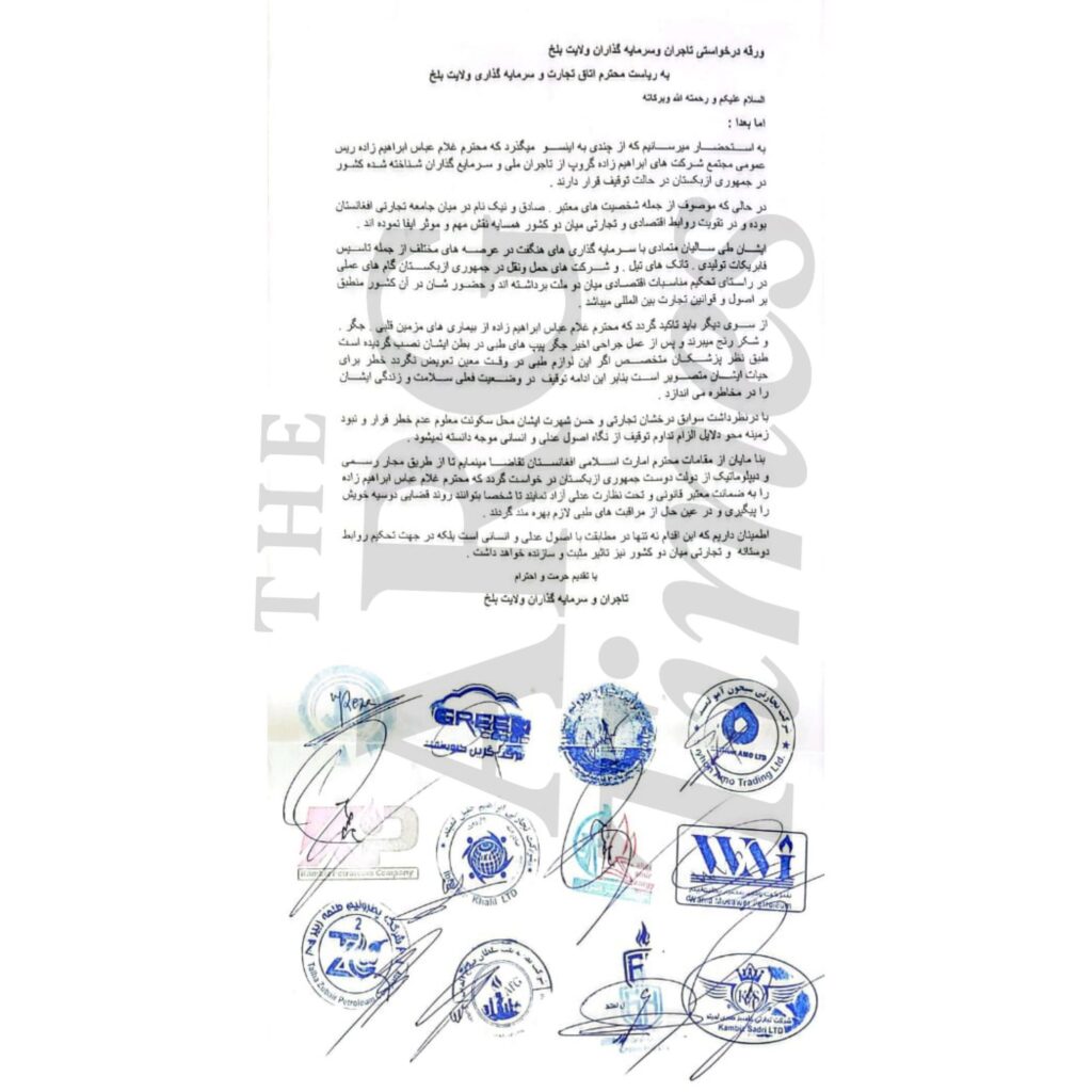 در حالی‌که پروندهٔ بازداشت عباس ابراهیم‌زاده در ازبیکستان وارد مرحلهٔ حساس قضایی شده است، شماری از بازرگانان و شرکت‌های تجارتی ولایت بلخ با ارسال یک مکتوب رسمی به مقام‌های طالبان، خواستار اقدام فوری برای رهایی او شده‌اند.