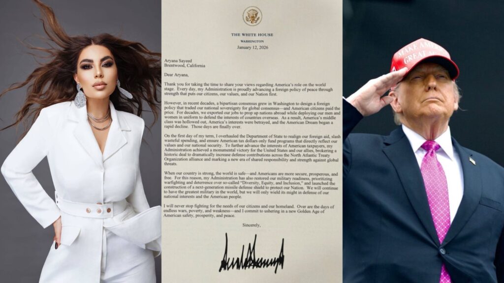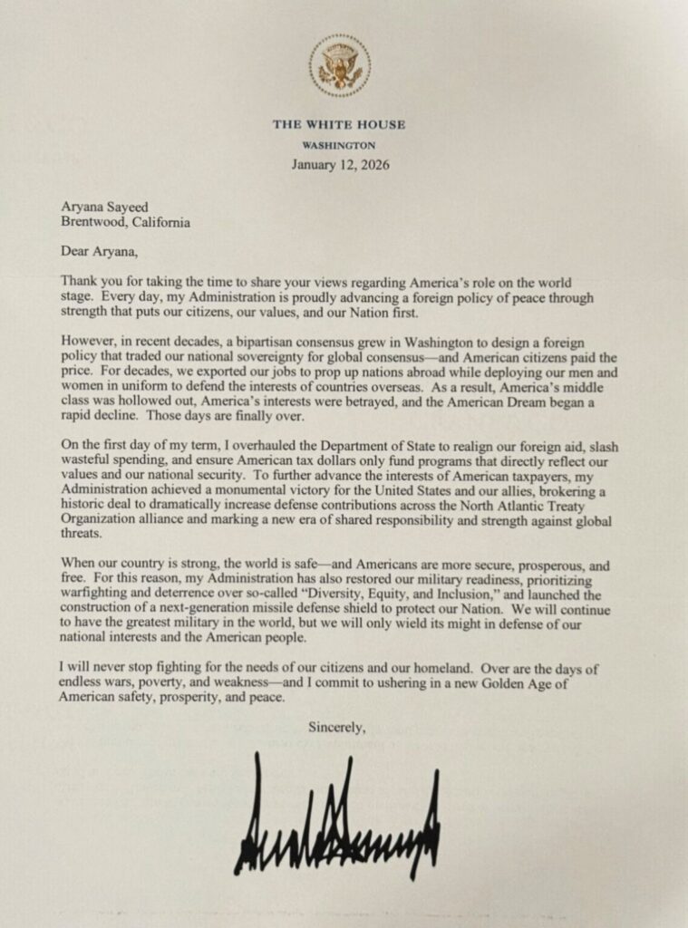 این نامه که به تاریخ ۱۲ جنوری ۲۰۲۶ از سوی کاخ سفید فرستاده شده، پس از آن صادر شد که آریانا سعید در ۵ سپتمبر ۲۰۲۵ طی نامهای از «طرف بیش از ۲۰ میلیون زن و دختر افغان» از رئیسجمهور امریکا خواسته بود موضعی تاریخی در دفاع از حقوق آنان اختیار کند.