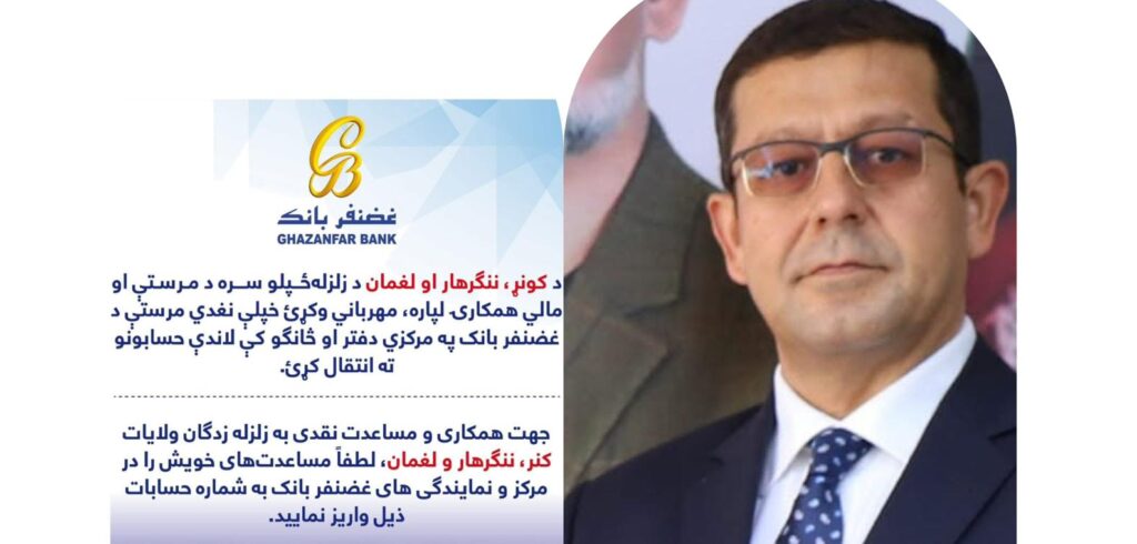 پس از زلزله اخیر در ولایات کنر، ننگرهار و لغمان، غضنفر بانک در صفحه رسمی فیسبوک خود اعلام کرد که مردم میتوانند مساعدتهای نقدی خویش را از طریق حسابهای افغانی و دالری این بانک به زلزلهزدگان انتقال دهند.